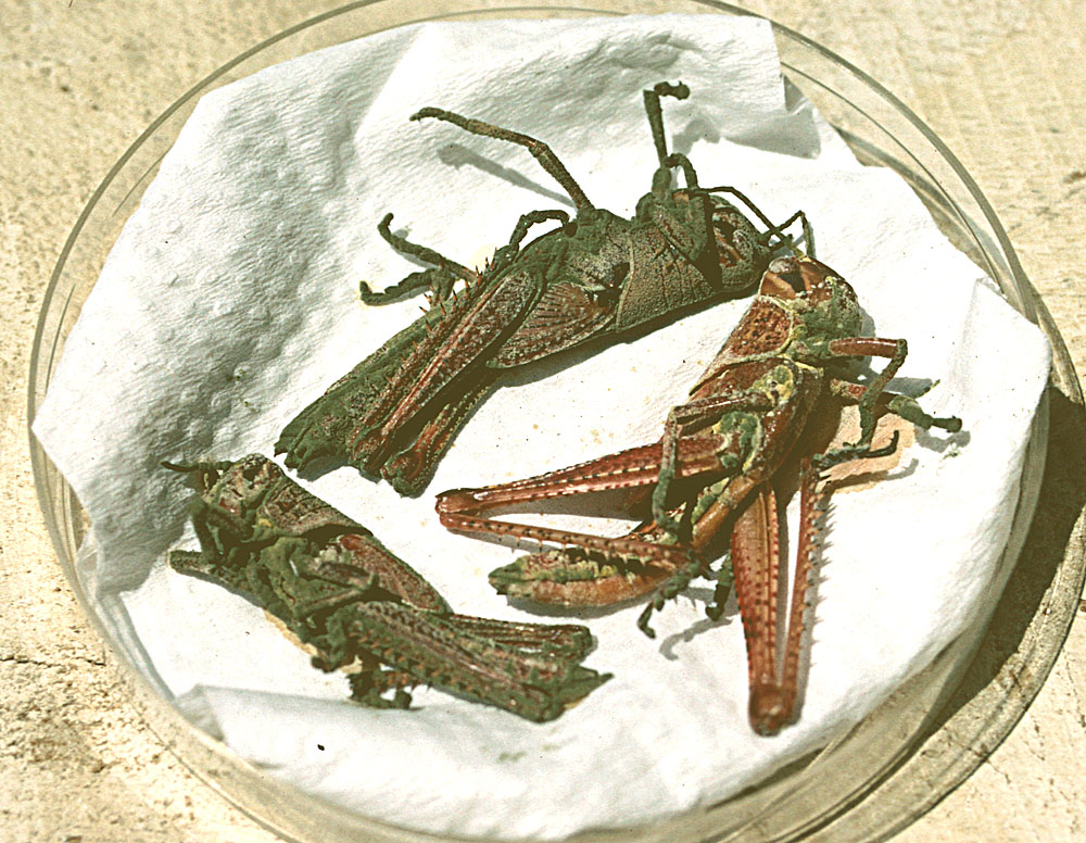 يشكل الجراد احد المشاكل العالمية المهمة خاصة عند حصول موجات الاجتياح للمناطق الزراعية ويكافح بالمبيدات الكيماوية ولكن السيطرة الحيوية تفرض نفسها لعدم جدوى المعالجات الكيماوية عندما تكون أعداد الجراد كبيرة جدا، والجراد يصاب بسلالات من M. anisopliae var acridum ويتم تحضيره في الزيت الذي يؤدي الى قتل الحشرات بسرعة مقارنة بالمستحضرات المائية. وتكون مؤثرة تحت ظروف قليلة الرطوبة، وتحتاج الى اسبوعين ليظهر تأثيرها في الحقل.