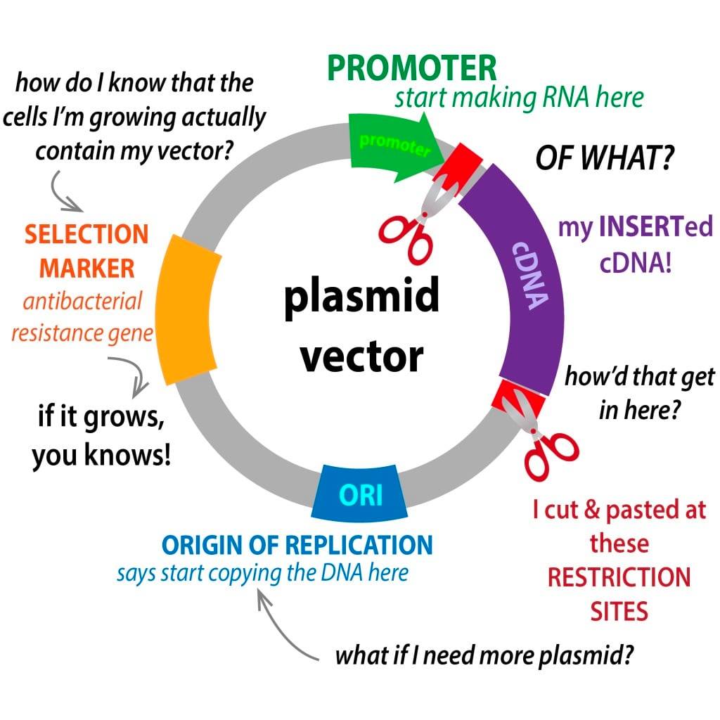 وهي من اشهر الناقلات ، وهو عبارة عن قطعة صغيرة من الحمض النووي قابلة للتكاثر بمعزل عن بقية الحمض النووي الموجود في الكروموسومات . وهي شبيهة بالفيروس الصغير ولكنها لا تحتوي على طبقة خارجيو من البروتين. و للبلازميد القدرة على التكاثر الذاتي وبمعزل عن بقية الكروموسومات الموجودة في الخلية . كما ان هناك بلازميدات تستطيع التكاثر داخل البكتيريا والخميرة في أن واحد . ويوجد نوعان من البلازميدات على حسب نوع الحمض النووي فيها ، فهناك البلازميد المصنوع من DNA ونوع الاخر مصنوع…