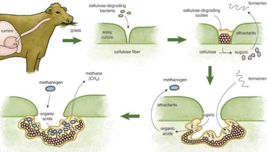 البكتريا التي تعيش في القناة الهضمية للحيوانات المجترة التي تتغذى على الحشائش وتفرز هذه البكتريا الأنزيمات اللازمة لتحليل السليلوز خارج خلاياها وتحوله إلى سكريات ثنائية مثل Cellobiose وتضم أكثر من جنس ونوع كلها لا هوائية تتعايش مع الحيوانات المجترة. ومنها Bacteroides ruminicola و Selenomonas ruminantium و Streptococcus bovis وغيرها .