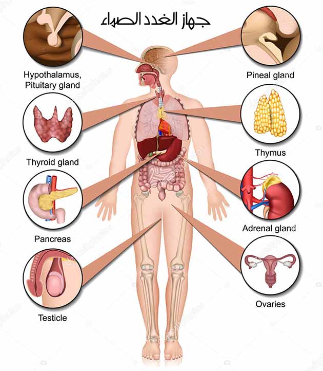 الغدد الصماء مجموعة من الغدد التي تفرز عصارتها بطريقة غيرمباشرة في الدم وتؤثر على مختلف غدد الجسم واعضائه تتوزع الغدد في كل انحاء الجسم .