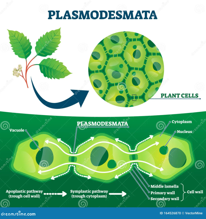هي قنوات مجهرية أنبوبية تخترق الجدران الخلوية للنبات مبطنة بغشاء بلازمي متصل بالغشاء الخلوي ويعبر في مركزها عادةً أنبوب Desmotubule (امتداد من الشبكة الإندوبلازمية الملساء) وتعمل هذه القنوات كمسارات مباشرة تسمح بانتقال الأيونات والجزيئات الصغيرة والبروتينات وقطع الـRNA والإشارات الهرمونية بين الخلايا المتجاورة مما يحقق تواصل وتنسيق عالي في الأنشطة الفسيولوجية ونمو الأنسجة النباتية وتعد مكملة للجهاز الوعائي في تبادل المواد.