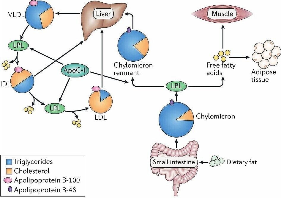 الدهون الثلاثية (Triglycerides" (TG :تحمل 90 % من الجليريدات الثلاثية على الكيلوميكرون (Chylomicron) (وهي البروتينات الدهنية التي تقوم بحمل الجليسريدات الثلاثية في الدم من الأمعاء الدقيقة الى الانسجة الدهنية) و 10 % تحمل على البروتينات الدهنية شديدة انخفاض الكثافة الـ (Very Low Density Lipoprotein- VLDL) ودائما تتعرض الجليسريدات الثلاثية الى بناء وهدم ، واحتراق هذه المركبات يمد الجسم بطاقة كبيرة يستخدمها الجسم عند نقص المواد الكربوهيدراتية .