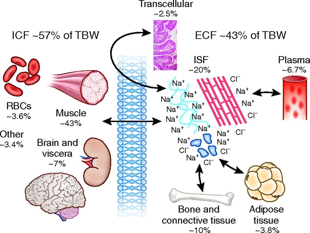 تشكل السوائل الجسمية حوالي 56 - 60% من وزن الجسم. فعلى سبيل المثال اذا كان متوسط وزن الشخص البالغ حوالي 70 كيلوجرام فإنه يحتوي على 40 لتر من السوائل الجسمية موزعة في الجسم