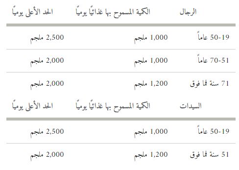 يعتمد مقدار الكالسيوم الذي تحتاج إليه على عمرك وجنسك. لاحظ أن الحد الأقصى في المخطط يُمثل الحد الأعلى — وليس الكمية التي تهدف للحصول عليها. إذا تجاوزت الحد الأعلى، فقد تزيد خطورة حدوث المشاكل الصحية المرتبطة بزيادة الكالسيوم لك.