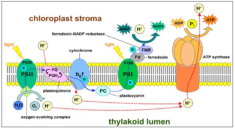 عملية تكوين ATP عبر أغشية أجهزة التخليق الضوئي من جراء توليد القوة الدافعة للبروتونات pmf عبر الأغشية فبعد استلام الطاقة الضوئية من قبل جهاز التخليق الضوئي PSII تنطلق الإلكترونات ذات الطاقة العالية وعند انسيابها خلال سلسلة نقل الإلكترونات إلى PSI تؤدي إلى توليد القوة الدافعة عبر الأغشية فيستفاد منها لتخلي ATP بواسطة المعقد المرتبط بالأغشية