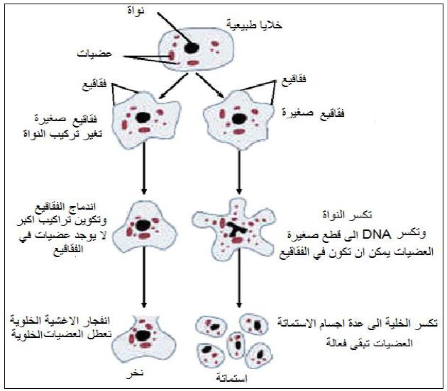 موت الخلايا المفاجئ اذ تظهر على الخلايا صفات مظهرية وفسلجية معينة ، فتظهر تغيرات في وظائف المايتوكوندريا والأغشية الخلوية بالإضافة إلى التغيرات المظهرية . واثناء عملية النخر يحصل جفاف متسارع لسايتوبلازم الخلايا مما يؤدي إلى تحطم أغشية العضيات داخلها وانطلاق أنزيمات الأجسام الحالة Lysosomes يلي ذلك تحلل الأنوية وحصول تدمير كامل للخلايا