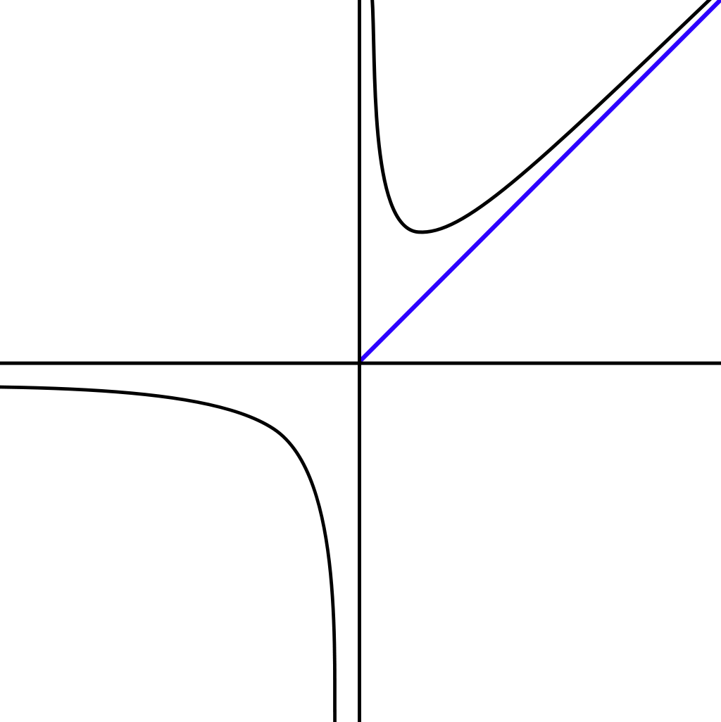 رسم دالة ذات خط تقارب أفقي، وخط تقارب رأسي، وآخر مائل (باللون الأزرق).