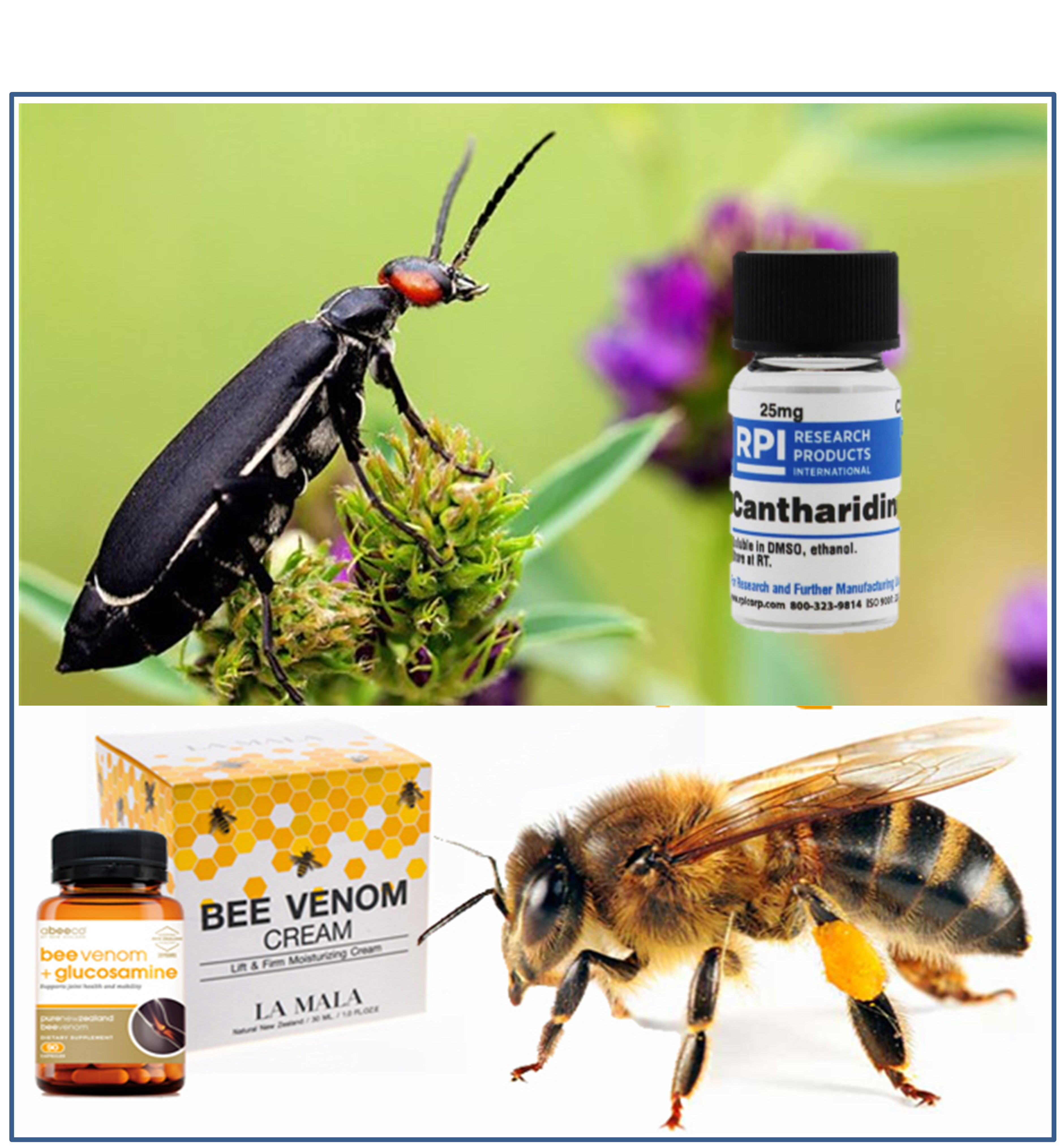 تعد مادة الكانثاردین Cantharidin من المواد المهيجة القوية جدا. والتي يتم الحصول عليها من الذبابة الاسبانية Spanish fly Lytta vesicatoria والتي تسبب بثرات موضعية على الجلد، وتستعمل هذه المادة في علاج الحالات المرضية للجهاز البولي والتناسلي، كما تستعمل في مجال البيطرة. كذلك فان حامض التانيك المستخلص من الأورام التي تسببها الحشرات على أشجار البلوط تستعمل حاليا في المجال الطبي فضلا عن سم النحل في علاج المفاصل...
