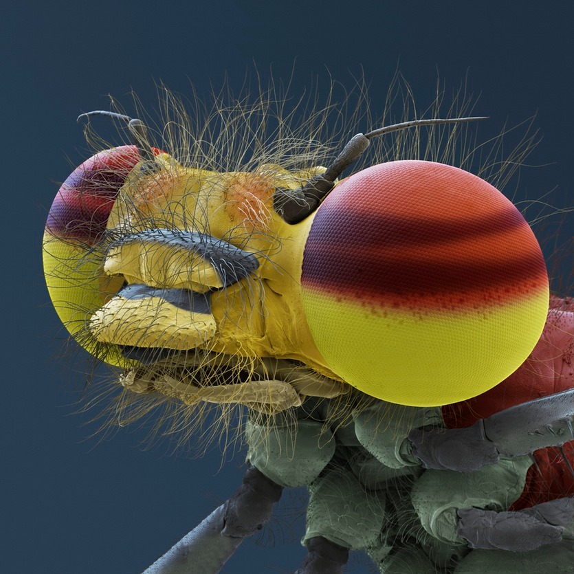 رأس ذبابة يوجد على كل جانب منه عين مركبة والتي تتكون من آلاف الأعين الصغيرة التى تسمى الوحدات البصرية..