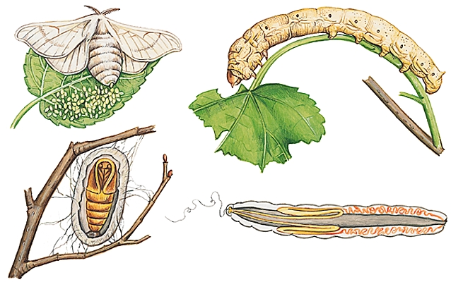 دودة الحرير تستطيع أن تضع في المرة الواحدة 450-500 بيضة، وللمحافظة عليه تقوم باتخاذ تدبير ذكيّ، وهو ربط البيض بعضه ببعض بواسطة مادة خيطية لاصقة تفرزُها. وبعد خروج اليرقات تقوم بربط نفسها بغصن شجرة بواسطة الخيوط التي تفرزها. ولكي تحافظ على هذه اليرقات تحيك شرنقة بواسطة الإفرازات الخيطية. وهذه اليرقات خلال 3-4 أيام تقوم بهذه الأعمال كلّها. وخلال هذه المدة تبدأ بالالتفاف حول نفسها آلاف المرات، وبذلك تُنتج من 900-1500م من الخيوط. وبعد أن تنتهي وبدون أن تستريح تنتقل من وضعية الشرنقة إلى حشرة كاملة.