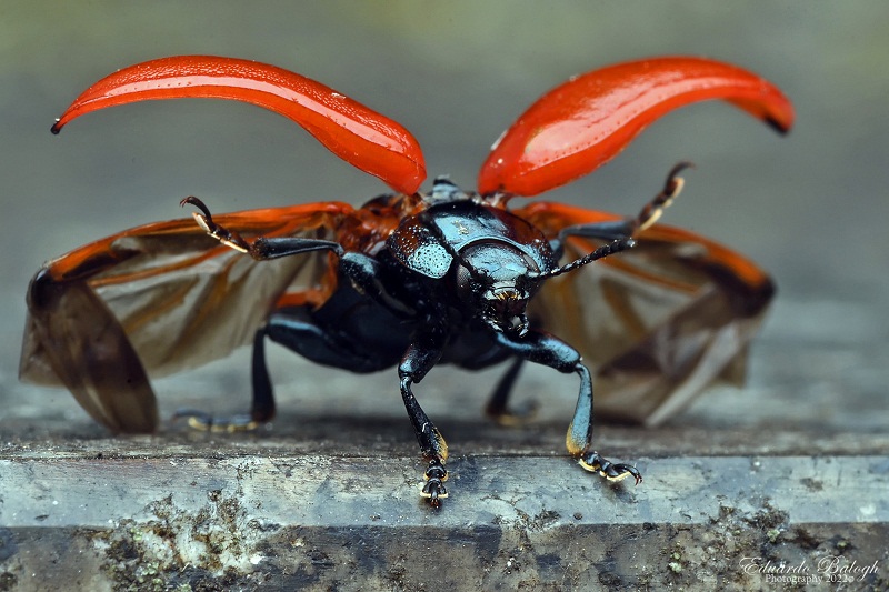 تأكل الخنفساء من أوراق العديد من الأشجار النفضية، ولكنها تفضل شجر القيقب. وتثقب يرقات الخنفساء في الغصون والفروع الميتة للشجرة وتدخل لتأكل من محتوياتها، وتبقى إلى أن تتحول إلى عذارى في هذا الخشب. وتستغرق دورة الحياة 2-3 سنوات.