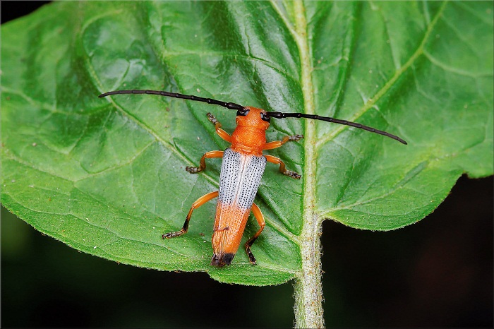 من رتبة غمديات الأجنحة- فصيلة الخنافس طوال القرون. هذه الخنفساء معروفة في العديد من الدول الآسيوية، مثل الهند، تايلاند، الصين، ميانمار، فيتنام... تأكل اليرقات من نباتات منتشرة في نطاقها الجغرافي، مثل شجيرات الحسك البنغالي، ونبات الساج..