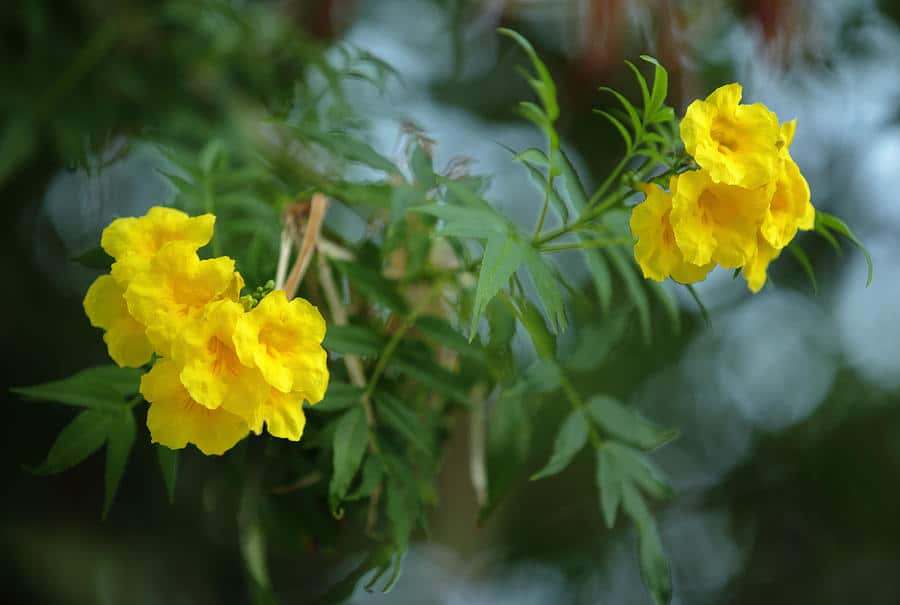 شجيرة صغيرة الحجم دائمة الخضرة أوراقها عريضة ذات أزهار صفراء اللّون على شكل بوق، تُزهر في فصل الربيع وتنمو تحت أشعة الشَّمس المباشرة في تربة غنيّة جيّدة التّصريف والتّهوية، تتحمّل الجفاف والحرارة المرتفعة، ويُفضَّل إزالة أزهارها المّيتة بشكل دوري لإطالة فترة الإزهار، كما يُمكن التحكم في شكلها وحجمها من خلال عمليّة التّقليم المنتظم، وهي من النّباتات الآمنة على الخزان نظرًا لعدم تمدّد جذورها.