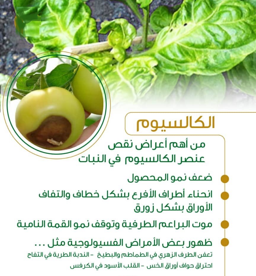 تظهر أعراض نقص الكالسيوم أولاً على الأوراق الحديثة النمو، وذلك لأن الكالسيوم عنصر غير متحرك في النبات، أي أنه لا ينتقل من الأوراق القديمة إلى الجديدة...
