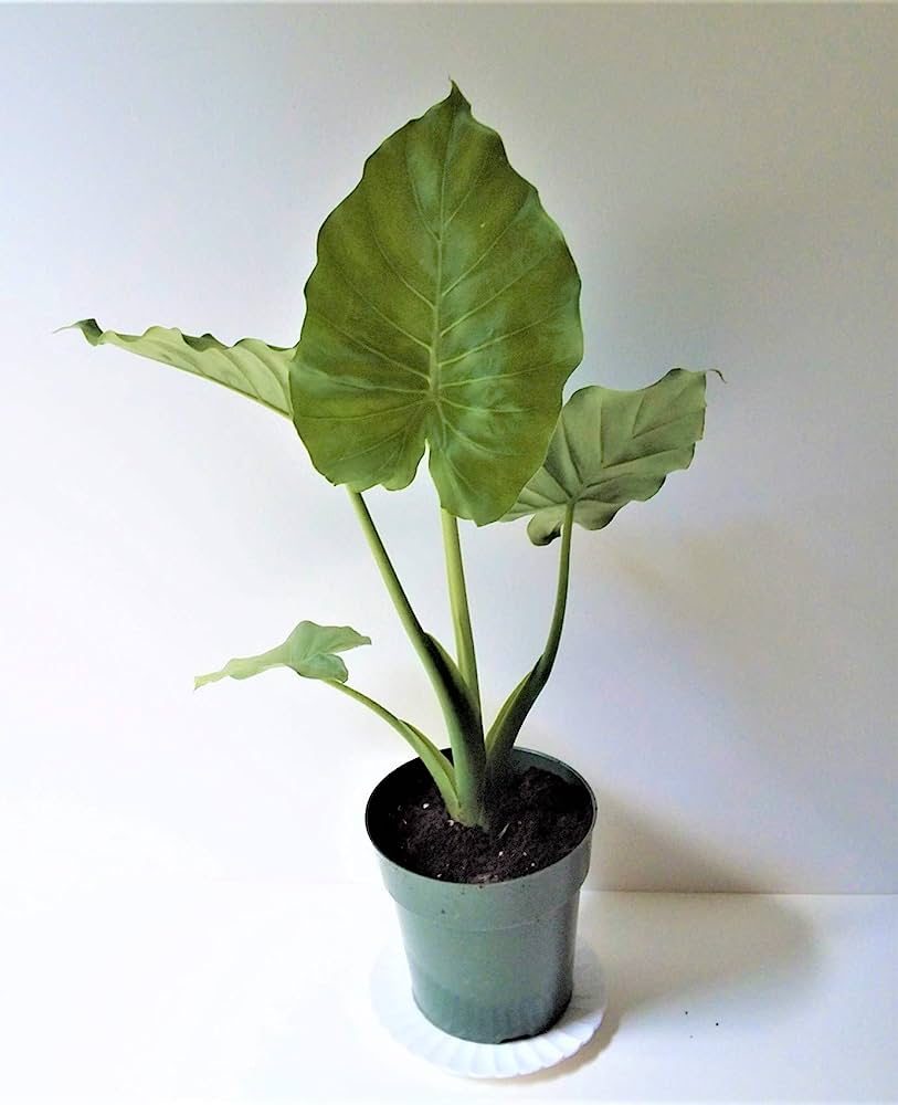 لون اخضر فاتح، متفرعة من قاعدة النبات لكون النبات ليس له ساق، يتراوح طول عنق الورقة 20 - 90 سم، له ازهار غير لافتة للنظر لكونها صغيرة نوعما وهي ذات لون اخضر وابيض تزهر خلال الربيع والصيف، لذا يتم اقتناء النبات لجمال أوراقه..