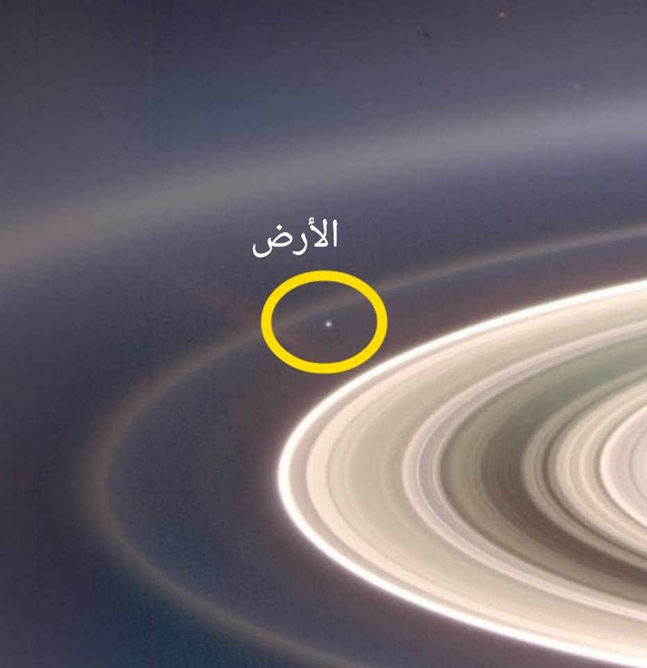 ‏ الأرض من عالم الفضاء: صورة التقطتها مركبة الفضاء كاسيني وتظهر حلقات زحل بمظهر متألق وتبدو الأرض كنقطة باهتة أعلى يسار حلقات زحل وهي تسبح في اعماق الفضاء على بعد 1.4مليار كيلومتر .