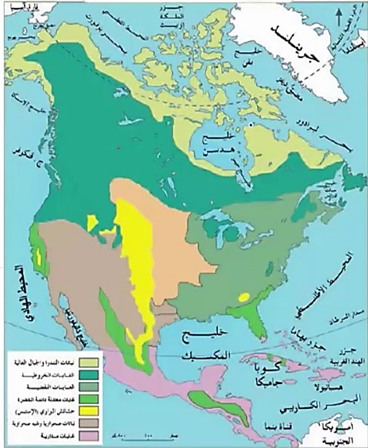 اقليم حشائش التندرا في قارة امريكا الشمالية: يتفق وجوده جغرافيا مع المناخ القطبي الذي يتميز بأن درجة الحرارة شتاءا تصل إلى الصفر وفي الصيف 10ْم ويصل طول فصل الشتاء إلى أكثر من(8) اشهر, وانخفاض الحرارة إلى دون التجمد, أما الأمطار فقليلة تصل إلى(254ملم), لذلك فأن هذه الظروف المناخية أدت إلى نمو نباتات قطبية قصيرة أهمها: الطحالب القطبية والإنشات التي تكون مراعي التندرا بين مضيق بيرنك وألاسكا شمال غرب كندا والى جرينلاند، فيها قطعان غزال الرنة التي تعيش على تلك الحشائش في فصل الصيف القصير(2- 3)اشهر.