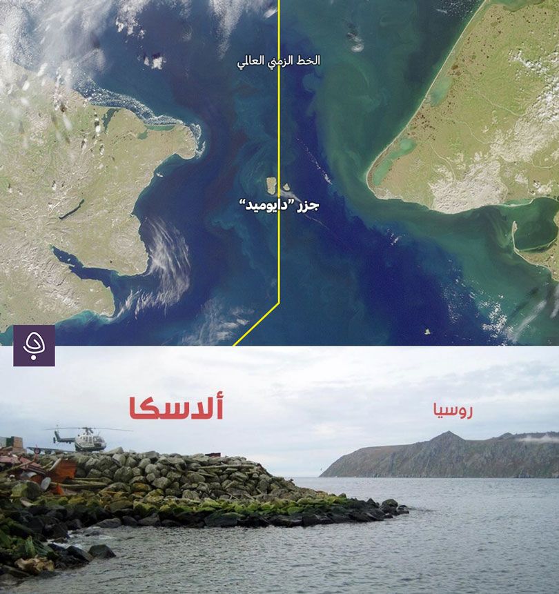 جزر دايوميد : تتكون من جزيرتين، تمتلك روسيا الجزيرة الأكبر بينهما، بينما تمتلك أميركا الجزيرة الثانية، تبلغ المسافة بين الجزيرتين 3.8 كلم، وهي أقرب مسافة بين البلدين، لكن فرق التوقيت بينهما هو 21 ساعة, تتقدم الجزيرة الكبيرة على الأخرى بـ21 ساعة ويعود سبب ذلك إلى مرور الخط الزمني العالمي بينهما، لذا سُميت الجزيرة الكبيرة بـ”جزيرة الغد“، بينما سُميت الجزيرة الصغيرة بـ”جزيرة الأمس“.