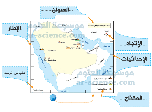 الخريطة : هي عبارة عن رسم يمثل سطح الأرض كاملاً أو جزء منه، والظواهر الطبيعية والبشرية التي تحدث عليه تمثيلاً كارتوغرافياً، بحيث يكون هذا الرسم تخطيطياً، وقد تم تصميمه بالاعتماد على مقياس رسم معين، ومسقط خريطة محدد، ورموز وألوان متعارف عليها, وتتكوّن الخريطة من عدة عناصر أساسية، وهي: عنوان الخريطة, إطار الخريطة, مقياس الرسم, مفتاح الخريطة , اتجاه الشمال, الإحداثيات الفلكية.