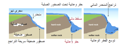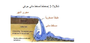 مساقط الصخور الجرفية : ان انحدار المياه فوق صخور شديدة الصلابة يشهد تطورا بطيئا يتمثل في إزالة ما يمكن ازالته من تكوينات سواء من سطح المنحدر أو من واجهته الامامية فيزداد انحداره بشده وقد يكون للمياه الساقطة من الأعلى وتكون تيار راجع نحو اسفل المنحدر دور في تقويضه فيؤدي الى انهيار كتل صخرية بشكل متتالي، فيتراجع المنحدر من الأسفل الى الوراء الى درجة لا تمس المياه الساقطة من الأعلى أي يكون بشكل متكهف وربما يستمر التقويض بسبب استمرار التيار الراجع نحو الأسفل بنشاطه والعمل على تقويض طبقات صخرية أخرى.