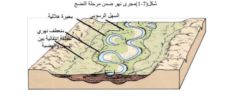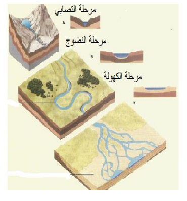 مرحلة النضوج : تنتقل مياه النهر من القسم الأعلى الى الأوسط من المجرى الذي يكون اقل انحدارا وعمقا وأكثر سعتا لذا تنخفض سرعة جريان النهر، ويسمى هذا الجزء من المجرى مرحلة النضوج، مما يسمح للمياه ان تعمل على تأكل قاع وضفاف النهر، اذ تنشط عمليات التعرية والإرساب ، لذا يتميز هذا الجزء بكثرة مظاهر التعرية والإرساب، ويكون مجرى النهر في هذا الجزء اكثر تميزا عما قبله وبعده من حيث خصائص القناة ونوع المظاهر الناتجة عن عمليات التعرية والإرساب ضمن القناة وخارجها .