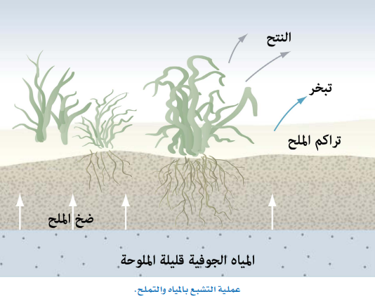 التملح : ـ يُعد التراكم البشري للأملاح الذائبة (القابلة للذوبان) في التربة المعروفة بالملوحة الثانوية مصدر قلق كبير ، لا سيما في المناطق القاحلة وشبه القاحلة من العالم، حيث يؤدي إلى إزالة الغطاء النباتي إلى جانب عدم كفاية الترشيح والتصريف وتخفيف أملاح النظام الهيدرولوجي. يؤدي المحتوى المرتفع من الأملاح الذائبة (مثل كلوريدات وكبريتات الصوديوم والكالسيوم والمغنيسيوم والبوتاسيوم) في مياه الري إلى جانب معدلات التبخر العالية إلى تملح / قلوية بمرور الوقت تصل في النهاية إلى مستويات ضارة بنمو النبات.