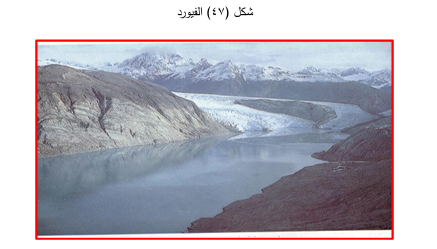الفيوردات Fjords : وهي عبارة عن اودية جليدية عميقة ومنحدرة الجوانب ومقطعها العرضي على شكل حرف U تنتهي عادة عند الأراضي الساحلية وتتحول هذه الأودية الى فيوردات عند غمرها بمياه البحر، التي تتوغل الى ابعاد متفاوتة تحددها مناسيب الوادي الجليدي . وغالباً ما تنتهي الفيوردات بمياه البحر عند عتبة صخرية على شكل جرف ومتعمقة دون منسوب مياه البحر، وتنتشر الفيوردات في سواحل الاسكا وشيلي ونيوزيلندة والنرويج .