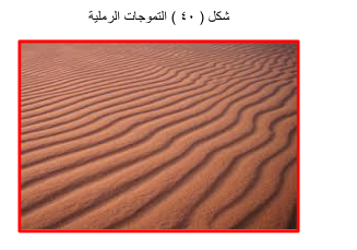 التموجات الرملية ( النيم ) Ripples : تعد التموجات الرملية من الأشكال التي نجمت عن عملية ترسيب سريعة فوق سطح منبسط نسبيا ، ويعتمد طول موجاتها على سرعة الرياح وخشونة الحبيبات الرملية ، اذ أن زيادة سرعة الرياح وخشونة حبيبات الرمل تؤدي الى زيادة طول موجة النيم .