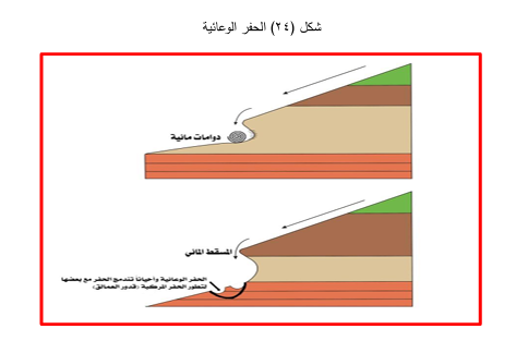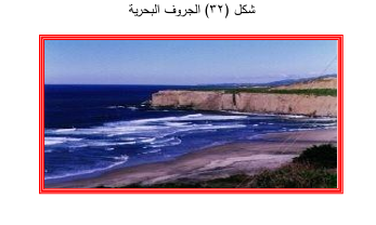 الجروف البحرية Sea Cliffs : تتكون الجروف البحرية عندما تتواجد في المناطق الساحلية طبقات صخرية صلبة متعاقبة فوق صخور لينة ، وتقوم الأمواج بحث الطبقات الصخرية اللينة بمعدل اسرع من الطبقات الصخرية الصلبة التي تبقى على شكل حائط مرتفع يشرف على مياه البحر ومواز لخط الساحل على شكل جروف بحرية .
