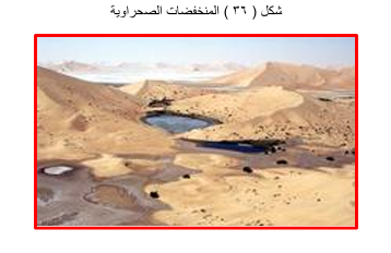 المنخفضات الصحراوية Depressions : تعد المنخفضات الصحراوية من أنماط الأشكال الأرضية في الأقاليم الجافة، وتنشأ في الأماكن التي تتكون من صخور هشة تمكنت الرياح من حتها ونقل مفتتاتها . يكون بعض هذه المنخفضات واسع وعميق تنبثق منه المياه الجوفية على شكل عيون ومن ثم تنشأ الواحات التي من ابرزها منخفضات الواحات التي توجد في صحراء مصر الغربية مثل الواحات الداخلة والخارجة والفرافرة .
