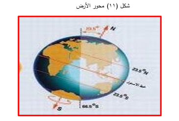 حركة الكرة الأرضية حول محورها : تدور الأرض حول محورها من الغرب الى الشرق بسرعة ١٦٦٠ كم / ساعة وتتم دورتها خلال ٢٤ ساعة ، ومحور الأرض يكون مائلا وهو خط وهمي يخترق الأرض من مركزها ويصل بين قطبيها الشمالي والجنوبي ويكون مائلاً على مستوى فلكها بزاوية مقدارها ٥ ۲۳٫ درجة .ينجم عن هذه الحركة تعاقب الليل والنهار ، وما لذلك من تأثير في الكائنات الحية . وتؤثر هذه الحركة في انحراف الرياح والتيارات البحرية الى يمين اتجاهها في نصف الكرة الشمالي والى يسار اتجاهها في نصف الكرة الجنوبي والتي تسمى بقوة كوريوليس.