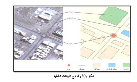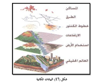 البيانات المكانية Spatial Data) وتتضمن معلومات عن موقع المعلم الجغرافي وشكله من مصادر مختلفة (صور جوية Arial photo، وصور الأقمار الاصطناعية satellite image أو خرائط maps).