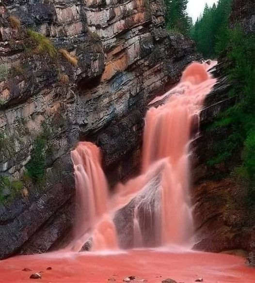 شلالات كاميرون الوردية في حديقة بحيرة واترتون الوطنية في ألبرتا كندا ، تحدث هذه الظاهرة عندما تهطل الأمطار بشكل غزير فتثير رسوب الأراغونيت التي تضيء بلون وردي عندما يسقط عليها الضوء فيتحول الشلال الصافي لذلك اللون الوردي البراق .