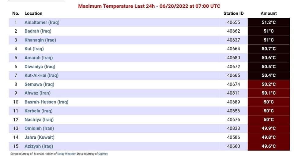 قضاء عين التمر في محافظة كربلاء المقدسة يسجل اعلى درجة حرارة عالميا حيث بلغت 51.2 م. بينما تصدرت بعض المحافظات الترتيب العالمي.