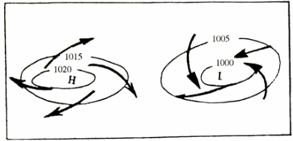 كما أن الرياح لا تهب نحو مراكز الضغط المنخفض مباشرة بل إنها تهب نحوها بحركة عكس عقارب الساعة. اذ تتحرك الرياح خارجة من مراكز الضغط المرتفع بحركة تشبه حركة عقارب الساعة.