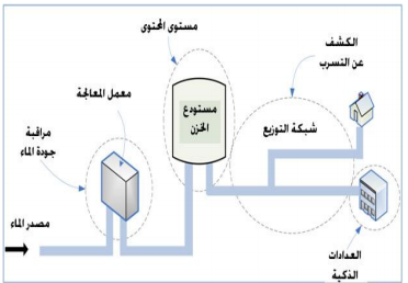 شبكة توزيع المياه الذكية: يتضمن الرصد في شبكة توزيع المياه الذكية، مراقبة محتوى خزانات جمع المياه، فضلاً عن كشف التسرب و مراقبة نوعية الماء في نقاط محددة على طول نظام التوزيع حيث يتم مراقبة خطوط انابيب توزيع المياه، من خلال نشر عدد كبير من أجهزة الاستشعار حول خط الأنبوب، بغية توفير المراقبة المستمرة ، يتم تحليل البيانات و المعلومات التي يتم جمعها عن بعد, و تعمل أجهزة المعالجة عندما يتم الكشف عن الحالات غير الاعتيادية, تقوم الشبكة بأعمال الإصلاح الذاتي من خلال المشغلات, لا تتطلب قرارات المشغلات.