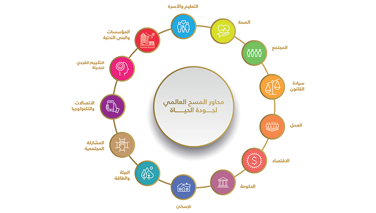 مؤشرات قياس جودة الحياة: تشمل الثروة وفرص العمل و البيئة العمرانية والصحة البدنية والعقلية والتعليم والترفيه وقضاء وقت الفراغ والانتماء الاجتماعي. وأيضا تشمل جودة الحياة التي يعيشها الإنسان أو يمثلها في الواقع الذي يعيش فيه الشخص بنفسه.