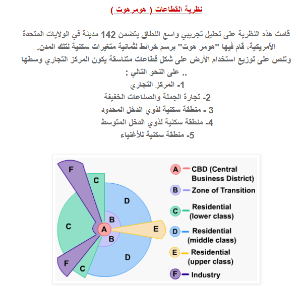 نظرية القطاعات : جاء بهذه النظرية الباحث الامريكي هومرهويت عام (1939) وقد استند في نظرية على حقائق تتعلق بسعر الارض وقيمة الايجار للمناطق السكنية واثر ذلك على قيمة استعمالات الارض الاخرى في المدينة واعتقد الباحث ان نمو المدينة يتم على شكل قطاعات متعددة تعتمد على طول شبكة المواصلات المختلفة للمدينة .