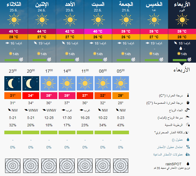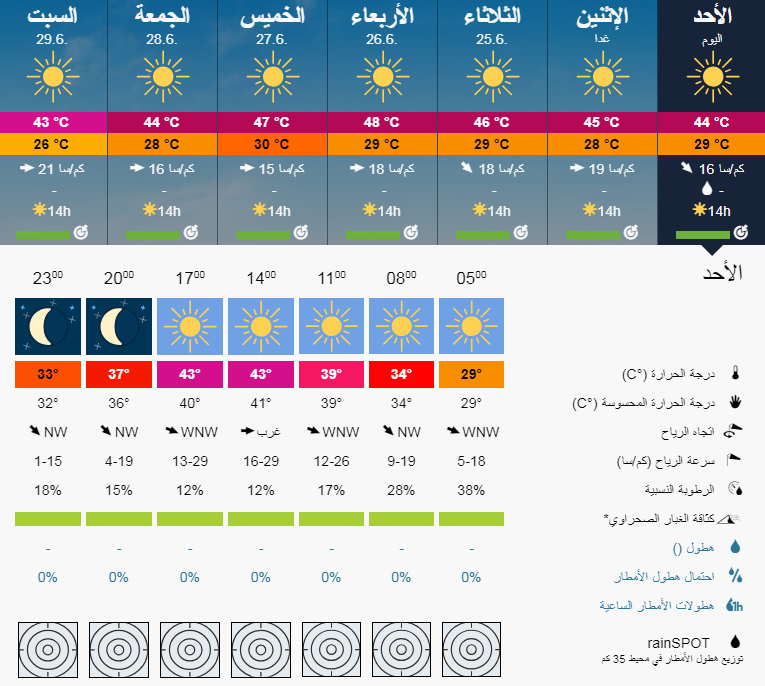 حالة الطقس لمدينة كربلاء ل سبعة 7 ايام قادمة وتشير التوقعات الى ارتفاع درجات الحرارة التي تقارب نصف درجة الغليان على مختلف عموم البلاد .