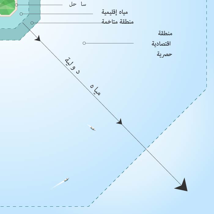 المياه الإقليمية: أو حدود الـ12عشر ميلا بحريا (22.2 كلم)، وسُميت بذلك لأن حدودها تبدأ من الشاطئ عند أدنى مستويات الجَزْر إلى عمق 12 ميلا بحريا، وهي المياه الإقليمية الخالصة وتَسري عليها القوانين المطبقة على الأراضي الوطنية وتتحمل الدولة فيها نفس المسؤوليات.