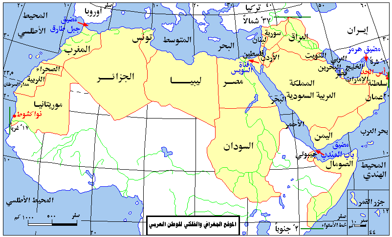الوطن العربي: يمتد الوطن العربي بين قارتي أفريقيا وآسيا، فهو يشغل الجزء الشمالي من قارة أفريقيا المطل على البحر المتوسط والمحيط الأطلسي والهندي، بينما يشغل قسمه الآسيوي الجزء الجنوبي الغربي من القارة, ويقع الوطن العربي بين دائرتي عرض2°جنوبا و 37.5°شمالا وبين خطي طول 60°شرقا و17°غرباً. و مساحته تبلغ 13,152,650 كم² .عدد سكانه 430 مليون نسمة, ويتكون من مجموع 22 دولة عربية من قارتي افريقيا واسيا.