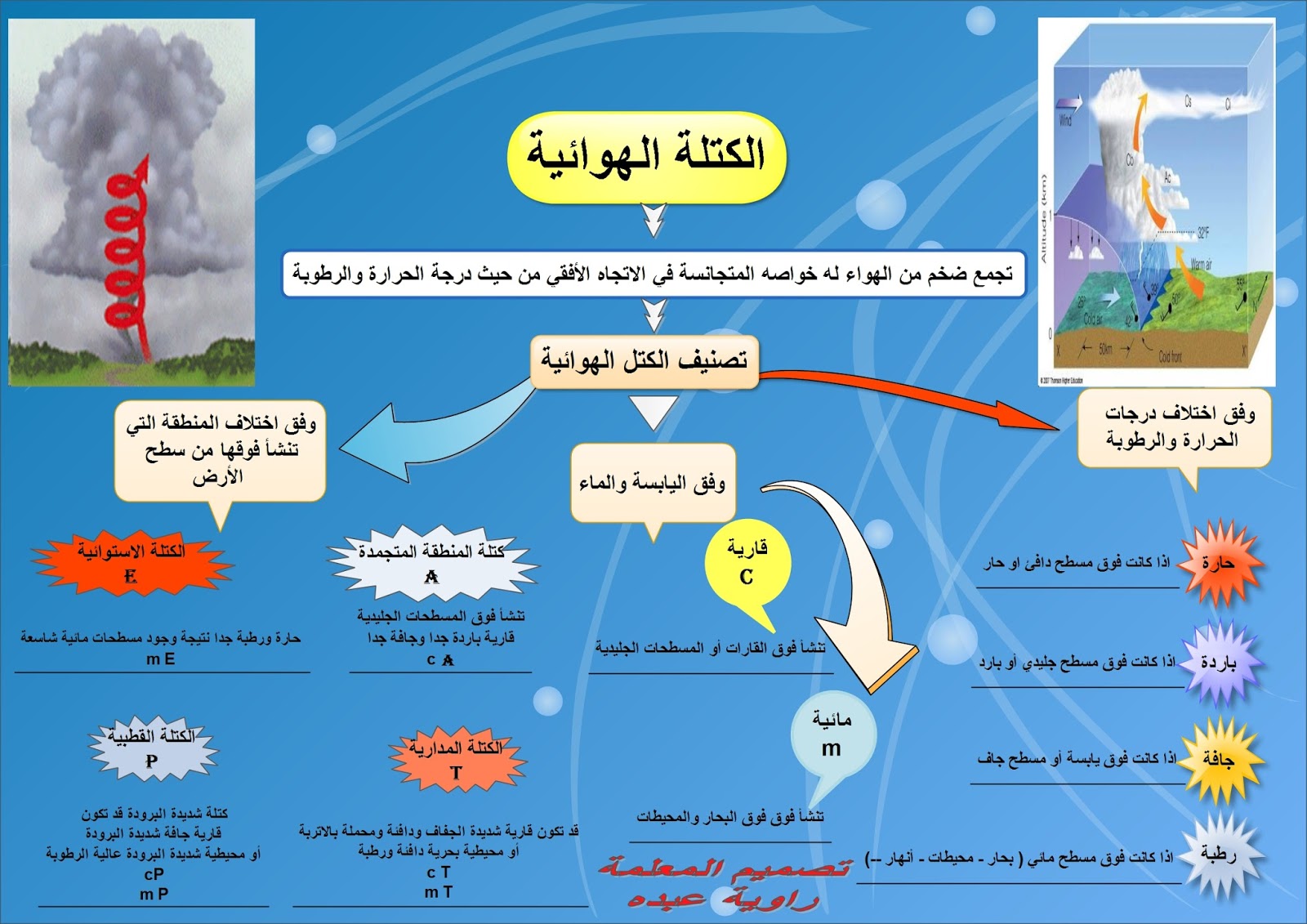 الكتل الهوائية: هي كتلة من الهواء المتجانس ذو خصائص محددة يكتسبها من طبيعة المنطقة التي يتكون بها ويوجد أنواع كثيرة للكتل الهوائية، تعتمد على المنطقة التي تشكلت بها, وتعتمد حرارة الكتل على طبيعة المنطقة، فإذا كانت المنطقة التي تشكلت بها باردة سيُطلق عليها كتلة باردة، أما لو تكونت في منطقة حارة سيطلق عليها كتلة حارة، ويُمكن أن تتشكل كتل هوائية حارة ورطبة معًا أو حارة وجافة والعكس.