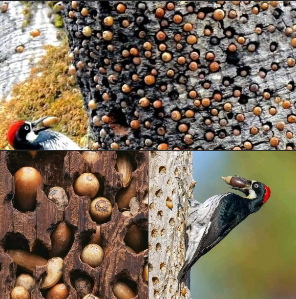 نقار الخشب يجمع جوز البلوط ويضعها في ثقوب جذوع الأشجار ليدخرها للشتاء، يختار نقار الخشب شجرة واحدة ويملئها بالثقوب ويمكن أن يصل عدد الثقوب الى 5000 ثقب في الشجرة الواحدة ،يصنع الثقوب بمقياس دقيق ويضع في كل ثقب حبة بلوط واحدة بحيث يصعب على الطيور الاخرى استخراجها