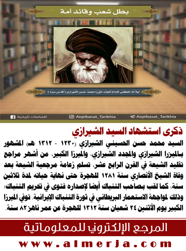 السيد محمد حسن الحسيني الشيرازي (1230 - 1312 هـ) المشهور بـالميزرا والمجدد الشيرازي والميرزا الكبير من أشهر مراجع تقليد الشيعة في القرن الرابع عشر تسلم زعامة مرجعية الشيعة بعد وفاة الشيخ الأنصاري سنة 1281 للهجرة حتى نهاية حياته لمدة ثلاثين سنة كما لقب بـصاحب التنباك أيضا لإصداره فتوى في تحريم التنباك وذلك لمواجهة الاستعمار البريطاني في ثورة التنباك الإيرانية. توفي الميرزا الكبير يوم الأثنين 24 شعبان سنة 1312 للهجرة عن عمر ناهز 82 سنة.