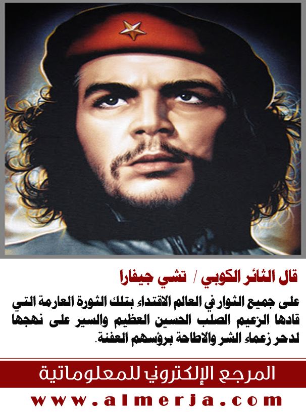 الثائر الكوبي / تشي جيفارا: إرنستو "تشي" جيفارا (14 يونيو 1928 - 9 أكتوبر 1967) ثوري كوبي ماركسي أرجينتيني المولد، وهو طبيب وكاتب وزعيم حرب العصابات وقائد عسكري ورجل دولة عالمي وشخصية رئيسة في الثورة الكوبية. أصبحت صورته المنمقة منذ وفاته رمزاً في كل مكان وشارة عالمية ضمن الثقافة الشعبية.