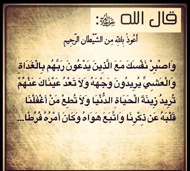 قال تعالى : {وَاصْبِرْ نَفْسَكَ مَعَ الَّذِينَ يَدْعُونَ رَبَّهُمْ بِالْغَدَاةِ وَالْعَشِيِّ يُرِيدُونَ وَجْهَهُ} [الكهف: 28]