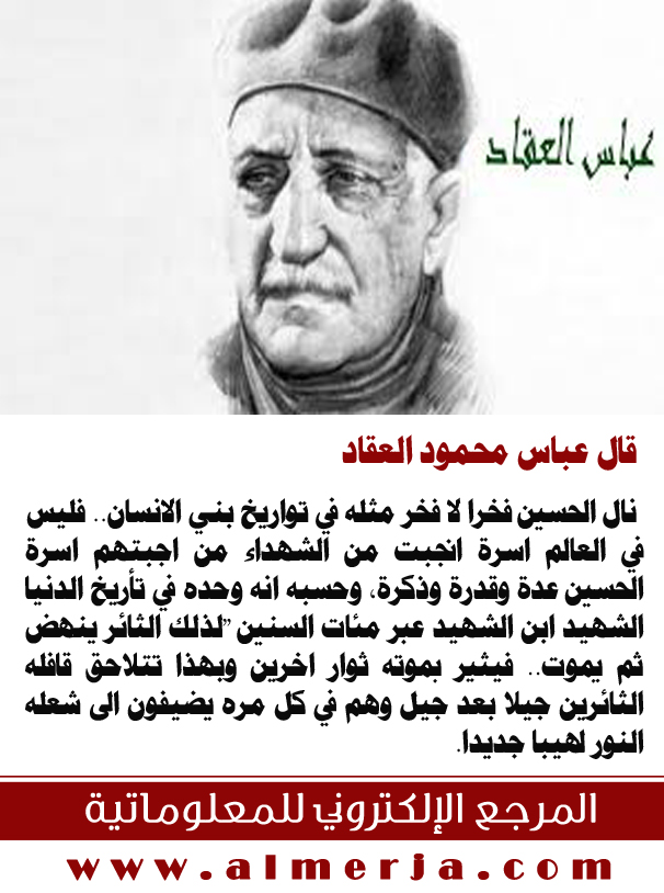 قالوا بحق الامام الحسين: عباس محمود العقاد أديب ومفكر وصحفي وشاعر مصري، ولد في أسوان عام 1889م، وهو عضو سابق في مجلس النواب المصري، وعضو في مجمع اللغة العربية، لم يتوقف إنتاجه الأدبي بالرغم من الظروف القاسية التي مر بها؛ حيث كان يكتب المقالات ويرسلها إلى مجلة فصول، كما كان يترجم لها بعض الموضوعات، ويعد العقاد أحد أهم كتاب القرن العشرين في مصر، وقد ساهم بشكل كبير في الحياة الأدبية والسياسية، وأضاف للمكتبة العربية أكثر من مائة كتاب في مختلف المجالات.