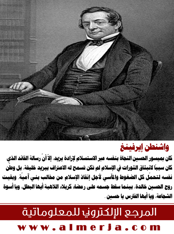 واشنطن إيرفينغ (3 أبريل178 -28 نوفمبر1859) مؤلف وكاتب مقالات وكاتب سير ومؤرخ ودبلوماسي أمريكي برز في النصف الأول من القرن التاسع عشر. من أشهر قصصه القصيرة "ريب فان وينكل" و"أسطورة سليبي هولو" اللتين نُشرتا في كتابه "دفاتر جيفري كرايون". من مؤلفاته التاريخية سير جورج واشنطن وأوليفر غولد سميث والنبي محمد. عالج عدة فترات من القرن 15 في إسبانيا التي تتناول مواضيع مثل كريستوفر كولومبس والأندلس وقصر الحمراء وسقوط غرناطة. عمل إيرفينغ سفيرًا للولايات…