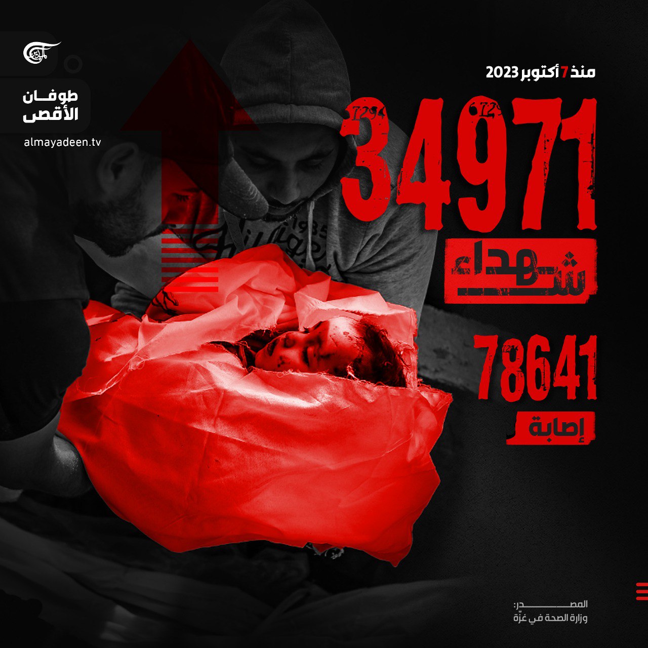 ارتفاع حصيلة العدوان الإسرائيلي على غزة إلى 34654 شهيداً و77908 إصابة.