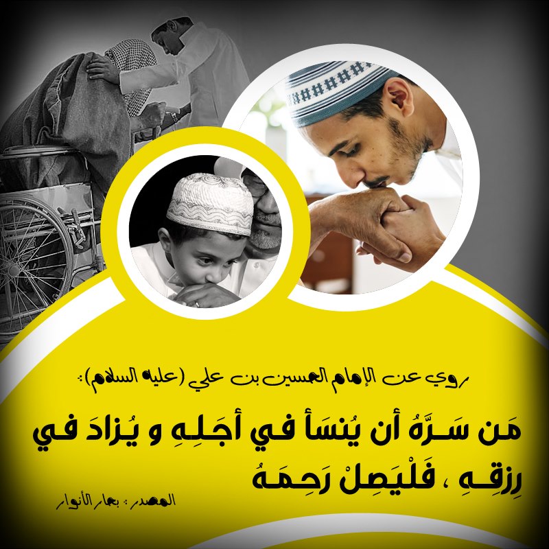 رُوِيَ عن الإمام الحسين بن علي ( عليه السلام ) أنهُ قَالَ : مَن سَرَّهُ أن يُنسَأ في أجَلِهِ ، و يُزادَ في رِزقِهِ ، فَلْيَصِلْ رَحِمَهُ .